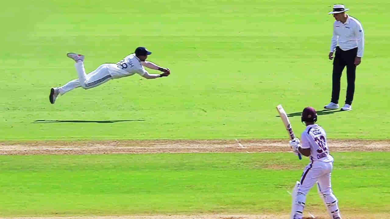 ಮೊಹಮ್ಮದ್ ಸಿರಾಜ್ ಎಸೆದ 8ನೇ ಓವರ್ನ ಎರಡನೇ ಎಸೆತದಲ್ಲಿ ತೇಜ್ನರೈನ್ ಚಂದ್ರಪಾಲ್ ಲೆಗ್ ಸೈಡ್ನತ್ತ ಬಾರಿಸಲು ಯತ್ನಿಸಿದ್ದರು. ಅತ್ತ ಸ್ಕ್ವೇರ್ ಲೆಗ್ನತ್ತ ಫೀಲ್ಡಿಂಗ್ನಲ್ಲಿದ್ದ ನಿತೀಶ್ ಕುಮಾರ್ ರೆಡ್ಡಿ ಕ್ಷಣಾರ್ಧದಲ್ಲೇ ಡೈವ್ ಹೊಡೆದು ಚೆಂಡನ್ನು ಹಿಡಿದಿದ್ದಾರೆ.