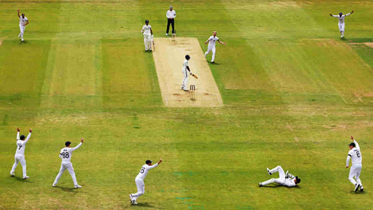 ಆದರೆ ಚೆಂಡು ಸೆಕೆಂಡ್ ಸ್ಲಿಪ್ ನಲ್ಲಿದ್ದ ಫೀಲ್ಡರ್ ಕೈ ತಾಗಿ ಫಸ್ಟ್ ಸ್ಲಿಪ್ ನತ್ತ ಸಾಗಿತು. ತಕ್ಷಣವೇ ಜೋ ರೂಟ್ ಡೈವ್ ಹೊಡೆದು ಚೆಂಡನ್ನು ತಡೆದರು. ಆದರೆ ತಡೆದ ಚೆಂಡು ನೇರವಾಗಿ ಹೋಗಿದ್ದು ವಿಕೆಟ್ ಕೀಪರ್ ಹಿಂದೆ ಇಟ್ಟಿದ್ದ ಹೆಲ್ಮೆಟ್ ಕಡೆಗೆ. ಅತ್ತ ಚೆಂಡು ಹೆಲ್ಮೆಟ್ಗೆ ಬಡಿಯುತ್ತಿದ್ದಂತೆ ಅಂಪೈರ್ ಪೆನಾಲ್ಟಿಯಾಗಿ ಟೀಮ್ ಇಂಡಿಯಾಗೆ 5 ರನ್ ಗಳನ್ನು ನೀಡಿದ್ದಾರೆ.