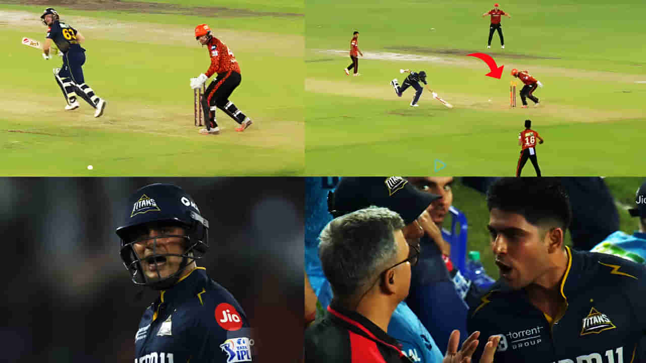 ಆದರೆ 13ನೇ ಓವರ್ನ ಕೊನೆಯ ಎಸೆತದಲ್ಲಿ ರನ್ ಕದಿಯುವ ಯತ್ನದಲ್ಲಿ ಶುಭ್ಮನ್ ಗಿಲ್ ರನೌಟ್ಗೆ ತುತ್ತಾಗಿದ್ದರು. ಅತ್ತ ಎಸ್ಆರ್ಹೆಚ್ ಆಟಗಾರರು ಮನವಿ ಮಾಡುತ್ತಿದ್ದಂತೆ ಫೀಲ್ಡ್ ಅಂಪೈರ್ ರಿಪ್ಲೇ ಪರಿಶೀಲನೆಗೆ ಮನವಿ ಮಾಡಿದರು. ಅದರಂತೆ ಟಿವಿ ಅಂಪೈರ್ ವಿಡಿಯೋ ಪರಿಶೀಲಿಸಿದ್ದು, ಈ ವೇಳೆ ಗಿಲ್ ಅವರ ಬ್ಯಾಟ್ ಕ್ರೀಸ್ನಿಂದ ಹೊರಗಿರುವುದು ಕಂಡು ಬಂತು. ಇದೇ ವೇಳೆ ವಿಕೆಟ್ ಕೀಪರ್ ಗ್ಲೌಸ್ ಕೂಡ ವಿಕೆಟ್ಗೆ ಬಡಿದಿತ್ತು.