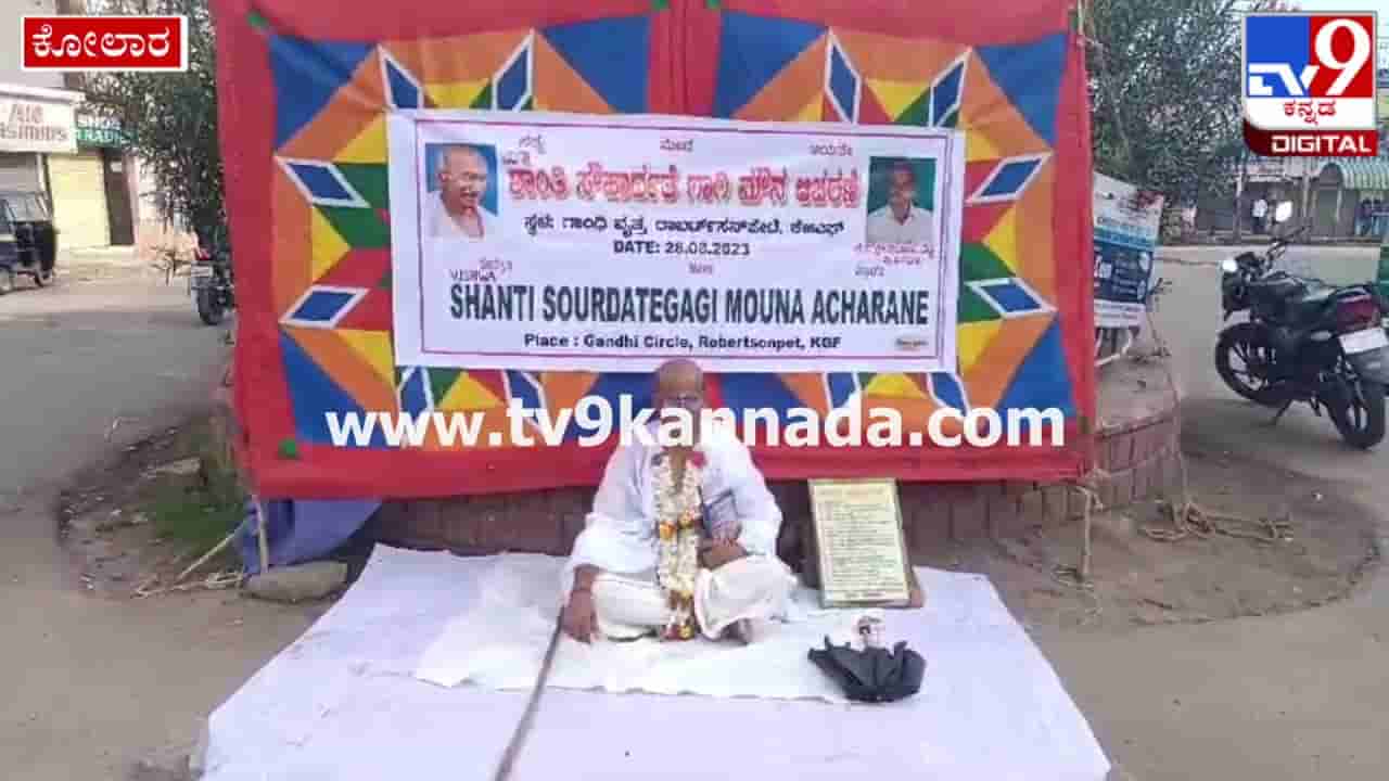 ಕೆಜಿಎಫ್ ತಾಲೂಕು ಕ್ಯಾಸಂಬಳ್ಳಿ ಗ್ರಾಮದ ಶ್ರೀನಿವಾಸರೆಡ್ಡಿ ಎಂಬುವವರು ಶಾಂತಿ ಸೌಹಾರ್ದತೆಗಾಗಿ 12 ಗಂಟೆಗಳ ಕಾಲ ಗಾಂಧಿ ವೇಷಧಾರಿಯಾಗಿ ಗಾಂಧಿ ಪ್ರತಿಮೆ ಬಳಿ ಕುಳಿತು ಮೌನ ಆಚರಣೆ ಮಾಡಿದ್ದಾರೆ. ಸಮಾಜದಲ್ಲಿ ಹಣಕ್ಕಾಗಿ ಸಣ್ಣ ಪುಟ್ಟ ಕಲಹಗಳಿಂದ ಮನುಷ್ಯನ ನೆಮ್ಮದಿ ಹಾಗೂ ಸಮಾಜದ ನೆಮ್ಮದಿ ಹಾಳಾಗುತ್ತಿದೆ ಎಂದು ಗಾಂಧಿ ವೇಷಧಾರಿ ಮೌನಾಚರಣೆ ಮಾಡಿದ್ದಾರೆ.