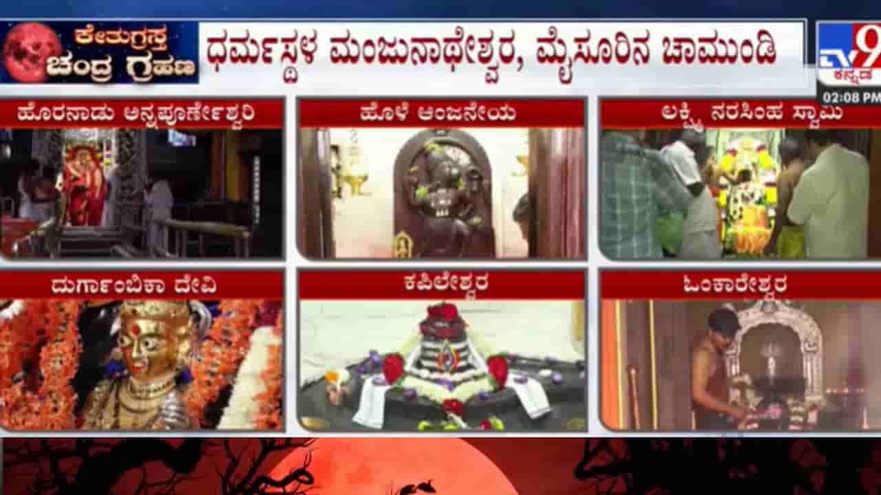 ಚಂದ್ರ ಗ್ರಹಣದ ಹಿನ್ನೆಲೆಯಲ್ಲಿ ಕರ್ನಾಟಕದ ಹಲವು ಪ್ರಮುಖ ದೇವಾಲಯಗಳು ನಿತ್ಯ ಪೂಜೆಗಳ ಬಳಿಕ ಬಂದ್ ಆಗಿವೆ. ಬೆಂಗಳೂರಿನ ಕಾಡುಮಲ್ಲೇಶ್ವರ, ಬೆಳಗಾವಿಯ ಕಪಿಲೇಶ್ವರ, ಕೊಡಗಿನ ಓಂಕಾರೇಶ್ವರ ದೇಗುಲಗಳು ಗ್ರಹಣ ಮೋಕ್ಷದ ಬಳಿಕ ಶುದ್ಧಿ ಕಾರ್ಯಗಳನ್ನು ನೆರವೇರಿಸಿ ಪುನಃ ತೆರೆಯಲಿದ್ದು, ಧಾರವಾಡದ ನುಗ್ಗಿಕೇರಿ ಆಂಜನೇಯ ಮತ್ತು ಚಿತ್ರದುರ್ಗದ ನೀಲಕಂಠೇಶ್ವರ ದೇಗುಲಗಳು ಎಂದಿನಂತೆ ತೆರೆದಿವೆ.