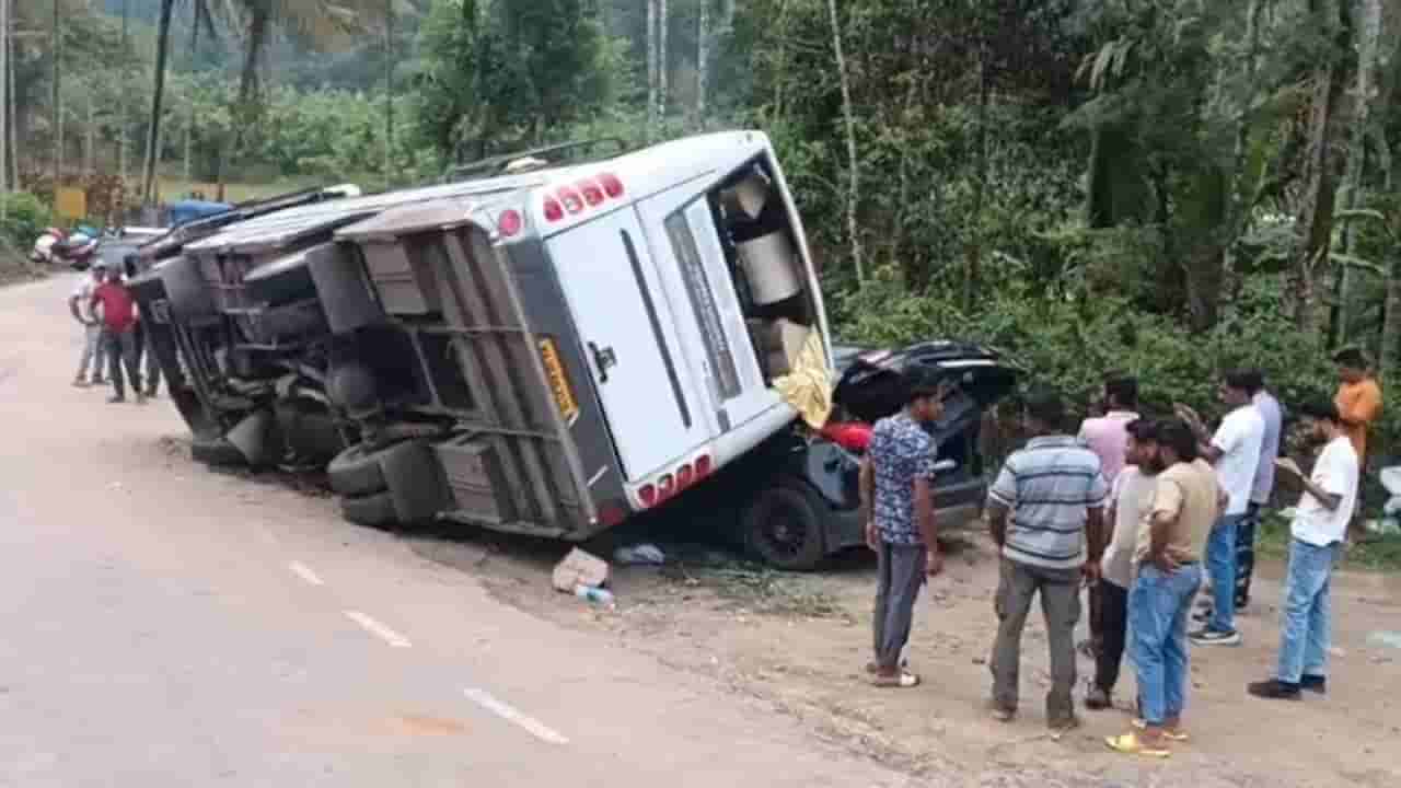 ಉರುಳಿ ಬಿದ್ದ ಪ್ರವಾಸಿಗರ ಬಸ್: ಕಾರಿನಲ್ಲಿದ್ದ ನಾಲ್ವರು ಜಸ್ಟ್ ಮಿಸ್!