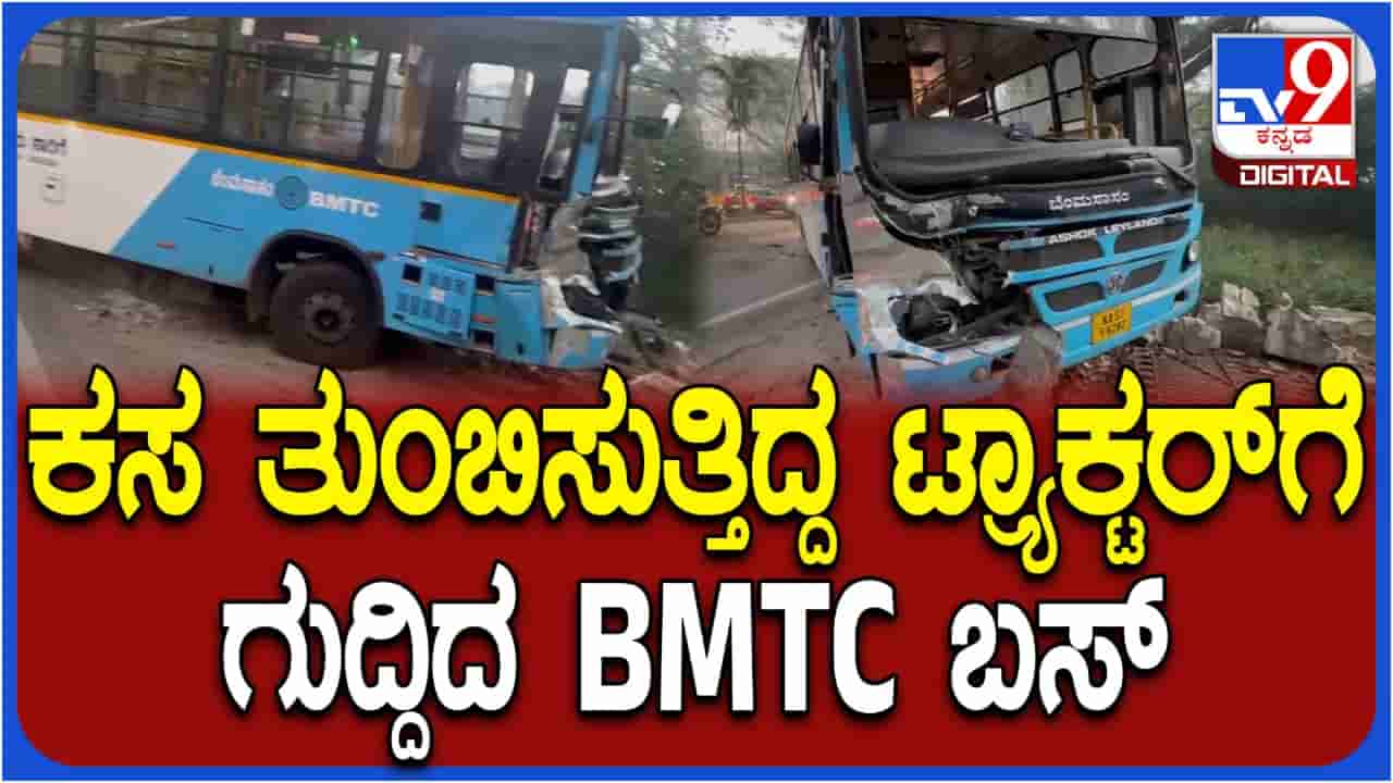 BMTC Bus Accident: ಯಲಹಂಕ ನ್ಯೂಟೌನ್ನಿಂದ ಮೆಜೆಸ್ಟಿಕ್ಗೆ ತೆರಳುತ್ತಿದ್ದ ಬಿಎಂಟಿಸಿ ಬಸ್ಸೊಂದು ಕಾವೇರಿ ಜಂಕ್ಷನ್ನಲ್ಲಿ ಟ್ರಾಕ್ಟರ್ಗೆ ಡಿಕ್ಕಿಹೊಡೆದು ಕೌಂಪೌಂಡ್ಗೆ ನುಗ್ಗಿದ ಕಾರಣ ಅಪಘಾತ ಸಂಭವಿಸಿದೆ. ಚಾಲಕನಿಗೆ ಸಣ್ಣಪುಟ್ಟ ಗಾಯಗಳಾಗಿವೆ. ಅದೃಷ್ಟವಶಾತ್ ಭಾರಿ ಅನಾಹುತ ಸ್ವಲದರಲ್ಲೇ ತಪ್ಪಿದೆ. ಅಪಘಾತದ ಬಗ್ಗೆ ವಿಡಿಯೋ ಸಹಿತ ಮಾಹಿತಿ ಇಲ್ಲಿದೆ.
