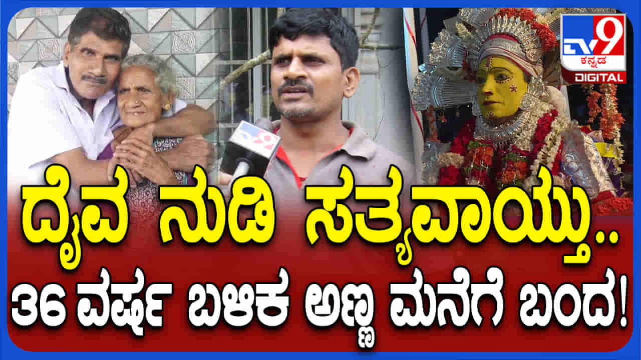 ಮಂಗಳೂರು, ಜೂನ್ 26: ಕೆಲಸಕ್ಕಾಗಿ ಮುಂಬೈಗೆ ಹೋಗಿ ಬಳಿಕ ಸಂಪರ್ಕಕ್ಕೆ ಸಿಗದ ಮಗ ಚಂದ್ರಶೇಖರ್ 36 ವರ್ಷಗಳ ಬಳಿಕ ಮನೆಗೆ ವಾಪಸ್ ಆಗಿದ್ದು, ತಾಯಿಯ ಮಡಿಲು ಸೇರಿದ್ದಾರೆ. ಆ ಮೂಲಕ ಕಾರಣಿಕ ಮಂತ್ರದೇವತೆ ದೈವದ (Daiva) ನುಡಿ ನಿಜವಾಗಿದ್ದು, ಅಚ್ಚರಿಯ ಘಟನೆಯೊಂದು ನಗರದಲ್ಲಿ ನಡೆದಿದೆ. ಈ ಬಗ್ಗೆ ಟಿ.ವಿ 9ಗೆ ಚಂದ್ರಶೇಖರ್ ಸಹೋದರ ಪ್ರಭಾಕರ್ ಹೇಳಿಕೆ ನೀಡಿದ್ದು, ನಮ್ಮ ಅಣ್ಣ ಕೆಲಸಕ್ಕೆಂದು ಮುಂಬೈಗೆ ಹೋದವರು ನಾಪತ್ತೆಯಾಗಿದ್ದರು. ಎಲ್ಲಾ ಕಡೆ ಹುಡುಕಿದರೂ ಸಿಕ್ಕಿರಲಿಲ್ಲ. ಮನೆಯ ದೈವಕ್ಕೆ ಹರಕೆಯನ್ನು ಹೇಳಿದ್ದೆವು. ಮನೆಯಲ್ಲಿ ನಡೆದ ದರ್ಶನ ಸೇವೆಯಲ್ಲಿ ಅಣ್ಣನ ಬಗ್ಗೆ ಕೇಳಿದೆವು. ಅಣ್ಣ ಜೀವಂತವಾಗಿ ಇರುವ ಬಗ್ಗೆ ದೈವ ನುಡಿ ಕೊಟ್ಟಿತು ಎಂದಿದ್ದಾರೆ. ವಿಡಿಯೋ ನೋಡಿ.