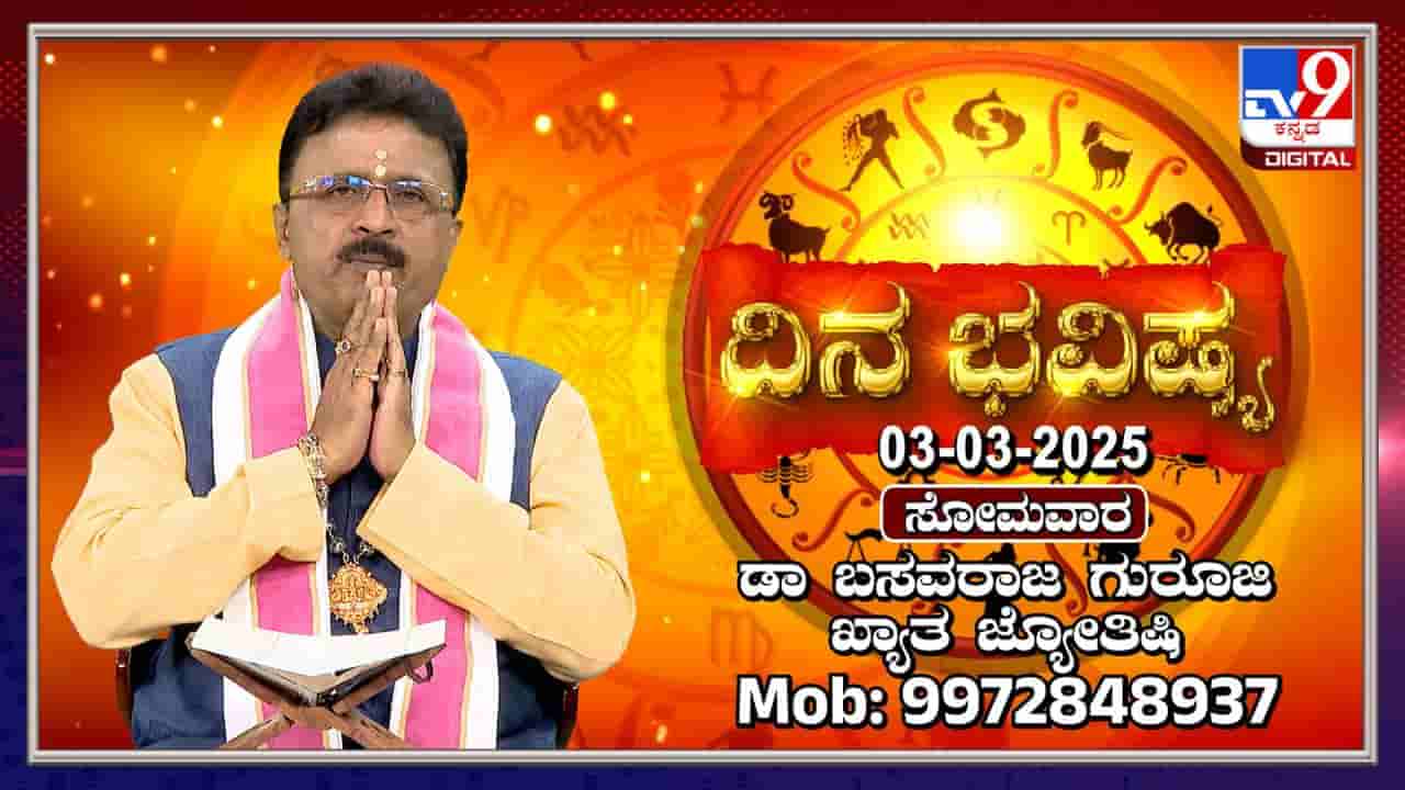 ಖ್ಯಾತ ಜ್ಯೋತಿಷಿ ಬಸವರಾಜ ಗುರೂಜಿ ಅವರು ಮಾರ್ಚ್ 3, ಸೋಮವಾರದ ರಾಶಿ ಭವಿಷ್ಯವನ್ನು ತಿಳಿಸಿದ್ದಾರೆ. ಈ ಲೇಖನದಲ್ಲಿ 12 ರಾಶಿಗಳಿಗೂ ಶುಭ ಮತ್ತು ಅಶುಭ ಫಲಗಳನ್ನು ವಿವರಿಸಲಾಗಿದೆ. ಪ್ರತಿ ರಾಶಿಗೆ ಸೂಕ್ತ ಬಣ್ಣ, ದಿಕ್ಕು ಮತ್ತು ಮಂತ್ರಗಳನ್ನು ಸಹ ಉಲ್ಲೇಖಿಸಲಾಗಿದೆ. ಮಹಾಶಿವರಾತ್ರಿಯಂದು ಶಿವನಿಗೆ ವಿವಿಧ ಅಭಿಷೇಕಗಳನ್ನು ಮಾಡುವುದರಿಂದ ಶುಭ ಫಲಗಳು ದೊರೆಯುತ್ತವೆ ಎಂಬುದನ್ನು ತಿಳಿಸಲಾಗಿದೆ.