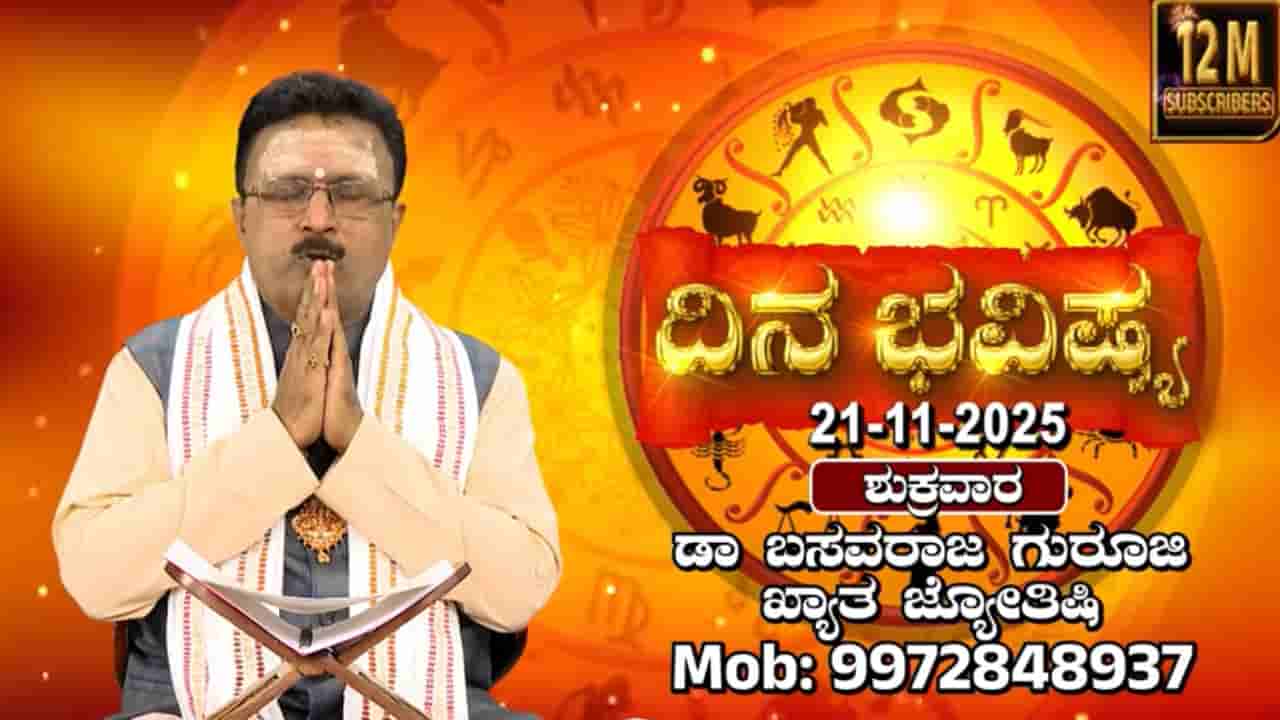 ಟಿವಿ9 ಡಿಜಿಟಲ್ ವಾಹಿನಿಯ ದಿನ ಭವಿಷ್ಯ ಕಾರ್ಯಕ್ರಮದಲ್ಲಿ ಡಾ. ಬಸವರಾಜ ಗುರೂಜಿ ಅವರು 21 ನವೆಂಬರ್ 2025 ರ ರಾಶಿಫಲವನ್ನು ನೀಡಿದ್ದಾರೆ. ಮೇಷ ರಾಶಿಯವರಿಗೆ ಆರು ಗ್ರಹಗಳ ಶುಭಫಲ, ಅದೃಷ್ಟ ಮತ್ತು ವ್ಯಾಪಾರದಲ್ಲಿ ಉತ್ತಮ ಯೋಗವನ್ನು ಸೂಚಿಸಿದ್ದಾರೆ. ವೃಷಭ ರಾಶಿಯವರು ಪ್ರಯತ್ನದಿಂದ ಯಶಸ್ಸು ಕಾಣುವರು ಎಂದು ತಿಳಿಸಿದ್ದಾರೆ.