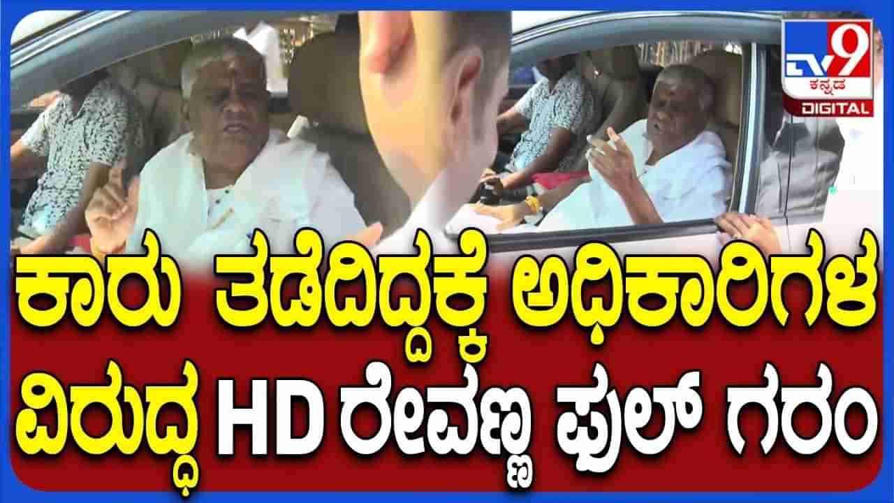 ಹಾಸನ, ಅಕ್ಟೋಬರ್​ 13: ಹಾಸನಾಂಬೆ ದರ್ಶನಕ್ಕೆಂದು ಬರುವಾಗ ತಮ್ಮ ಕಾರನ್ನು ತಡೆದ ಅಧಿಕಾರಿಗಳ ವಿರುದ್ಧ ಶಾಸಕ ಹೆಚ್​.ಡಿ.ರೇವಣ್ಣ (H.D. Revanna) ಗರಂ ಆದ ಪ್ರಸಂಗ ನಡೆದಿದೆ. ತಮ್ಮ ಭದ್ರತಾ ವ್ಯವಸ್ಥೆಯೊಂದಿಗೆ ಶಿಷ್ಟಾಚಾರ ಪಾಲನೆ ಅಧಿಕಾರಿಗಳಿಗೆ ತಿಳಿಸದೆ ಹಾಸನಾಂಬೆ ದರ್ಶನಕ್ಕೆ ರೇವಣ್ಣ ಆಗಮಿಸಿದ್ದರು. ಹೀಗಾಗಿ ಅವರ ಕಾರನ್ನು ಕಂದಾಯ ಇಲಾಖೆ ಸಿಬ್ಬಂದಿ ತಡೆದಿದ್ದಾರೆ. ಈ ವೇಳೆ ಗರಂ ಆದ ಶಾಸಕರು, ಬಳಿಕ ಕಾರಿನಿಂದ ಇಳಿದು ನಡೆದುಕೊಂಡು ದರ್ಶನಕ್ಕೆ ತೆರಳಿದ್ದಾರೆ. ಹೆಚ್​.ಡಿ.ರೇವಣ್ಣ, ಪತ್ನಿ ಭವಾನಿಗೆ ಸಿಬ್ಬಂದಿ ನೇರ ಎಂಟ್ರಿ ಕೊಟ್ಟಿದ್ದಾರೆ.