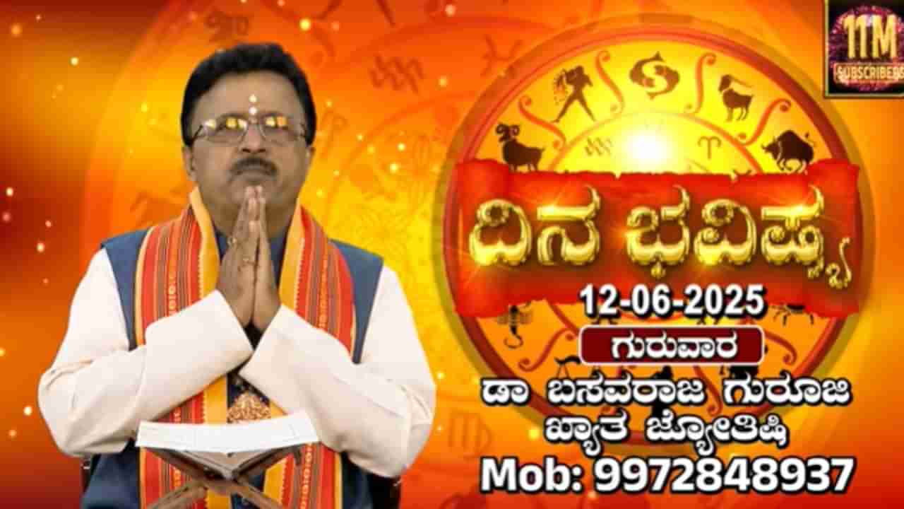 ಈ ದಿನ 12-06-2025 ಗುರುವಾರ, ವಿಶ್ವಾವಸು ಸಂವತ್ಸರ, ಉತ್ತರಾಯಣ, ಜೈಷ್ಠ ಮಾಸ, ಗ್ರೀಷ್ಮ ಋತು, ಕೃಷ್ಣ ಪಕ್ಷ, ಪಾಡ್ಯ, ಮೂಲ ನಕ್ಷತ್ರ, ಶುಭಯೋಗ, ಕೌಲವಕಾರಣ ಇದ್ದು, ಈ ದಿನದ ರಾಹುಕಾಲ 1.54 ರಿಂದ 3.30 ರ ವರೆಗೆ ಇರುತ್ತದೆ. ಸರ್ವ ಸಿದ್ಧಿ ಕಾಲ, ಸಂಕಲ್ಪ ಕಾಲ 12.19 ರಿಂದ 1.53 ರ ವರೆಗೆ ಇರಲಿದೆ. ಗುರುಗಳ ಲಹರಿಗಳು ಇರುವ ದಿನ ಇದಾಗಿದ್ದು, ದ್ವಾದಶ ರಾಶಿಗಳ ಫಲಾಫಲವನ್ನು ಖ್ಯಾತ ಜ್ಯೋತಿಷಿ ಮತ್ತು ವಾಸ್ತು ಶಾಸ್ತ್ರಜ್ಞ ಡಾ ಬಸವರಾಜ ಗುರೂಜಿ ಇಲ್ಲಿ ವಿವರಿಸಿದ್ದಾರೆ.