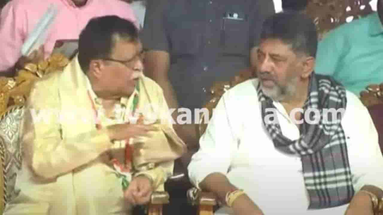 ತುಮಕೂರು, ಜೂನ್ 21: ಸಹಕಾರ ಸಚಿವ ಕೆಎನ್ ರಾಜಣ್ಣ ಅವರ 75ನೇ ಹುಟ್ಟುಹಬ್ಬದ ಅಮೃತ ಮಹೋತ್ಸವ, ಅಭಿನಂದನಾ ಗ್ರಂಥ ಬಿಡುಗಡೆ ಸಮಾರಂಭ ಕಾರ್ಯಕ್ರಮ ತುಮಕೂರಿನ ಕಾಲೇಜು ಮೈದಾನದಲ್ಲಿ ಬಹು ಅದ್ದೂರಿಯಾಗಿ ನಡೆಯುತ್ತಿದೆ. ರೇಷ್ಮೆ ಅಂಗಿ ಮತ್ತು ರೇಷ್ಮೆ ಪಂಚೆ ತೊಟ್ಟ ಬರ್ತ್ಡೇ ಬಾಯ್ ಮದುಮಗನಂತೆ ಮಿಂಚುತ್ತಿದ್ದರು. ಅವರ ಮತ್ತು ರಾಜ್ಯದ ಉಪ ಮುಖ್ಯಮಂತ್ರಿ ಡಿಕೆ ಶಿವಕುಮಾರ್ (DCM DK Shivakumar) ನಡುವಿನ ಸಂಬಂಧ ಅನ್ಯೋನ್ಯವಾಗಿಲ್ಲ ಎಂದೇ ಎಲ್ಲರೂ ಭಾವಿಸಿದ್ದರು. ಅದರೆ ಶಿವಕುಮಾರ್ ಕಾರ್ಯಕ್ರಮಕ್ಕೆ ಆಗಮಿಸಿದರಲ್ಲದೆ ರಾಜಣ್ಣ ಅವರಿಗೆ ಹೂಗುಚ್ಛ ನೀಡಿ, ಶಾಲು ಹೊದಿಸಿ ಗೌರವಿಸಿ ಹುಟ್ಟುಹಬ್ಬದ ಶುಭಾಷಯಗಳನ್ನು ತಿಳಿಸಿದರು. ಪ್ರತಿಯಾಗಿ ರಾಜಣ್ಣ ಕೂಡ ಶಿವಕುಮಾರ್ರನ್ನು ಸನ್ಮಾನಿಸಿ ನೆನಪಿನ ಕಾಣಿಕೆ ನೀಡಿದರು.