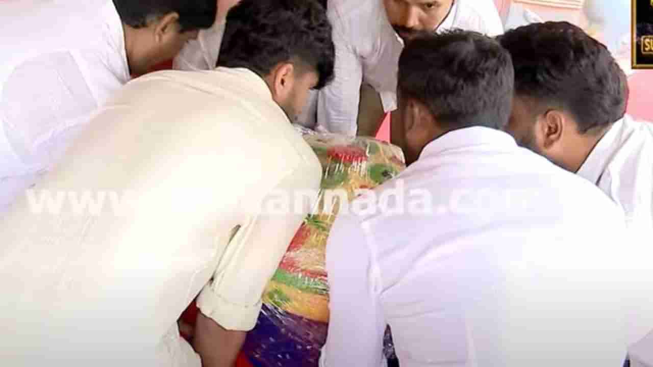 ಬೆಂಗಳೂರು, ಆಗಸ್ಟ್ 29: ಭಾರೀ ಗಾತ್ರದ ಗಣೇಶನನ್ನು ನಾವು ನೋಡುತ್ತಿದ್ದೇವೆ, ಆದರೆ ಗಣಪನಿಗೆ ನೈವೇದ್ಯ ರೂಪದಲ್ಲಿ ಭಾರೀ ಗಾತ್ರದ ಲಡ್ಡು ಸಮರ್ಪಿಸುವುದನ್ನು ಮೊದಲು ನೋಡಿದ್ದೀರಾ? ಇಲ್ಲಿ ನೋಡಿ, ರಾಜೀವ್ ಗಾಂಧಿ ನಗರ ನಿವಾಸಿಗಳ ಕ್ಷೇಮಾಭಿವೃದ್ಧಿ ಸಂಘದವರು ತಮ್ಮ ಏರಿಯಾದಲ್ಲಿ ಪ್ರತಿಷ್ಠಾಪಿಸಿರುವ ವಿನಾಯಕನಿಗೆ 108 ಕೆಜಿ ತೂಕದ ಲಡ್ಡುವನ್ನು ಸಮರ್ಪಣೆ ಮಾಡಿದ್ದಾರೆ. ಅದನ್ನು ಹೊರಲು 6 ಜನ ಬೇಕಾಗಿತ್ತು ಮಾರಾಯ್ರೇ! ಅಂದಹಾಗೆ ಸಂಘದವರು ಕಳೆದ ಹತ್ತು ವರ್ಷಗಳಿಂದ ಇಲ್ಲಿ ಗಣೇಶನನ್ನು ಪ್ರತಿಷ್ಠಾಪಿಸುತ್ತಿದ್ದಾರೆ ಮತ್ತು ಪ್ರತಿಭಾರಿ ಭಿನ್ನತೆಯನ್ನು ಕಾಯ್ದುಕೊಳ್ಳುತ್ತಾರೆ. ಈ ಬಾರಿ ಏರಿಯಾದ ಗೃಹಿಣಿಯರೆಲ್ಲ ಡೊಳ್ಳು ಬಾರಿಸುತ್ತ ಕುಣಿಯುತ್ತ ಪಾರ್ವತೀಪುತ್ರನನ್ನು ಬರಮಾಡಿಕೊಂಡಿದ್ದಾರೆ. ಇಲ್ಲಿನ ನಿವಾಸಿಗಳು ಮೂರು ದಿನಗಳ ಕಾಲ ನಡೆಯುವ ಗಣೇಶೋತ್ಸವದ ಬಗ್ಗೆ ಉತ್ಸಾಹದಿಂದ ಮಾತಾಡಿದ್ದಾರೆ.