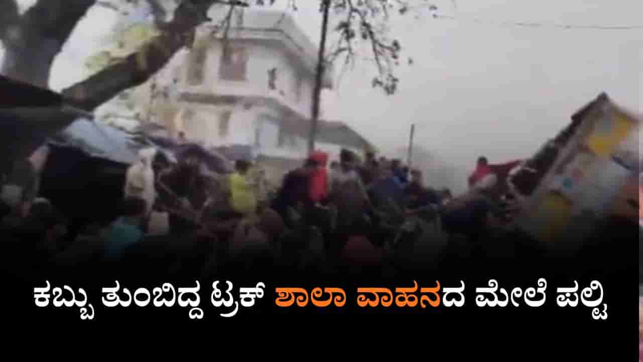 Video: ಕಬ್ಬು ತುಂಬಿದ್ದ ಟ್ರಕ್ ಶಾಲಾ ವಾಹನದ ಮೇಲೆ ಪಲ್ಟಿ