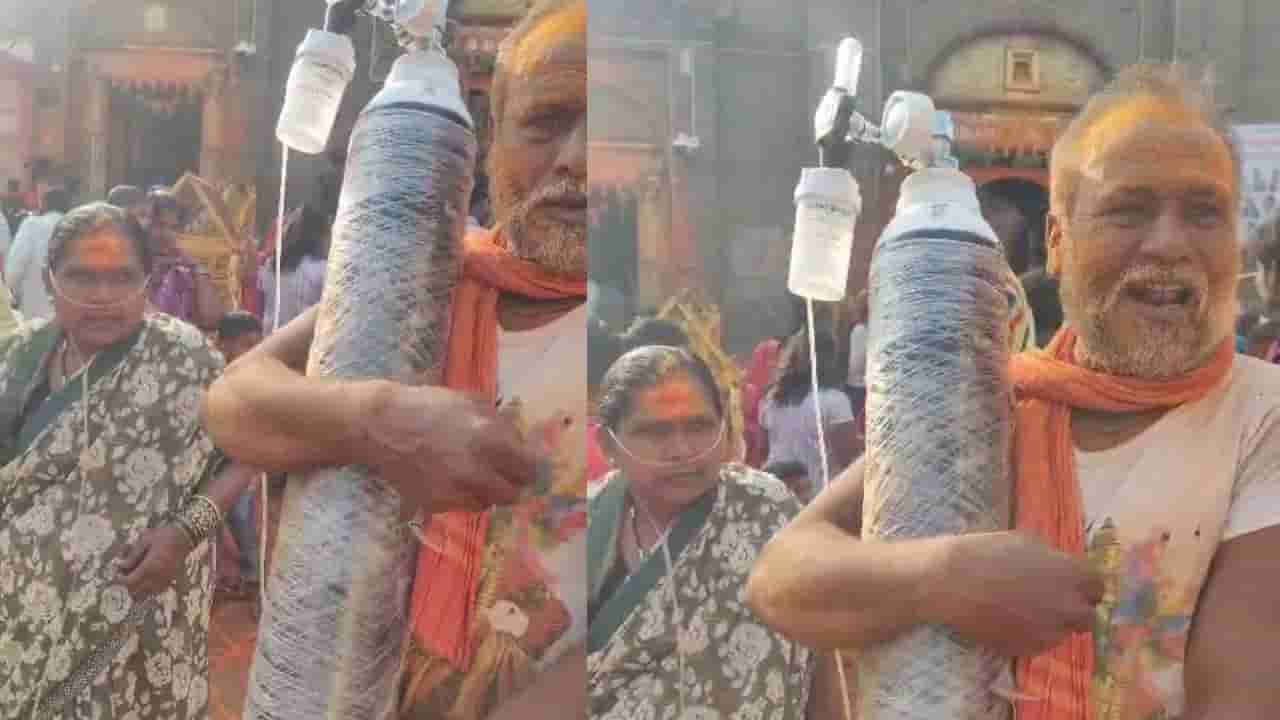 ಆಕ್ಸಿಜನ್ ಸಿಲಿಂಡರ್ ಹಿಡ್ಕೊಂಡೇ ಮಾಯಕ್ಕಾ ದೇವಿ ದರ್ಶನ: ಪತ್ನಿಯ ಹರಕೆ ಸಲ್ಲಿಸಲು ಪತಿಯ ಪ್ರೀತಿಯ ಆಸರೆ