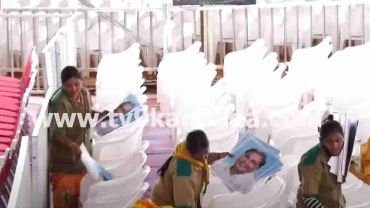 ಮೈಸೂರು, ಜುಲೈ 19: ಪ್ರಚಾರದ ಗೀಳಿಗೆ ಒಂದು ಮಿತಿ ಬೇಡ್ವಾ ಸ್ವಾಮಿ ಅಂತ ಟಿವಿ9 ಬೆಳಗ್ಗೆ ಕೇಳಿದ್ದು ಕೆಲಸ ಮಾಡಿದಂತಿದೆ. ತವರು ಜಿಲ್ಲೆ ಮೈಸೂರಲ್ಲೇ ತನ್ನ ಜನಪ್ರಿಯತೆ ಕುಗ್ಗಿದೆ ಅಂತ ಅನುಮಾನಕ್ಕೆ ಸಿಲುಕಿರುವ ಮುಖ್ಯಮಂತ್ರಿ ಸಿದ್ದರಾಮಯ್ಯನವರು, ಅದನ್ನು ಪುನರ್ಸ್ಥಾಪಿಸುವ ಭಾಗವಾಗಿ ಸಾಧನಾ ಸಮಾವೇಶಕ್ಕೆಂದು (Sadhana Samavesha) ಮೈಸೂರಿನ ಮಹಾರಾಜ ಕಾಲೇಜು ಮೈದಾನದಲ್ಲಿ ವ್ಯವಸ್ಥೆಗೊಳಿಸಿದ ಕುರ್ಚಿಗಳ ಮೇಲೆ ತಮ್ಮ ಭಾವಚಿತ್ರವನ್ನು ಇರಿಸುವ ಸೂಚನೆ ನೀಡಿದ್ದರು. ಅವುಗಳನ್ನು ಈಗ ತೆಗೆಯುತ್ತಿರುವ ದೃಶ್ಯವನ್ನು ಇಲ್ಲಿ ನೋಡಬಹುದು. ಈ ಕ್ರಮ ಹೇಗೆ ಜನಪ್ರಿಯತೆ ಹೆಚ್ಚಿಸಲು ಕಾರಣವಾಗುತ್ತದೆ ಅಂತ ಸಿದ್ದರಾಮಯ್ಯನವರೇ ಹೇಳಬೇಕು. ಕಾರ್ಯಕ್ರಮವನ್ನು ಸರ್ಕಾರದ ಸಾಧನಾ ಸಮಾವೇಶ ಅಂತ ಭಾವಿಸಲಾಗಿತ್ತು. ಆದರೆ ನಡೆಯುತ್ತಿರೋದೇ ಬೇರೆ, ಅಥವಾ ಸರ್ಕಾರವೆಂದರೆ ಸಿದ್ದರಾಮಯ್ಯ ಮಾತ್ರ ಅಂತಲೂ ಇರಬಹುದು ಮಾರಾಯ್ರೇ!
