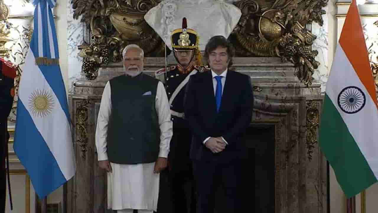 5 ರಾಷ್ಟ್ರಗಳ ಪ್ರವಾಸದಲ್ಲಿರುವ ಪ್ರಧಾನಿ ನರೇಂದ್ರ ಮೋದಿ ಇದೀಗ ಅರ್ಜೆಂಟಿನಾದಲ್ಲಿದ್ದಾರೆ. ಬ್ಯೂನಸ್ ಐರಿಸ್ನಲ್ಲಿ ಪ್ರಧಾನಿ ಮೋದಿಗೆ ಆತ್ಮೀಯ ಸ್ವಾಗತ ನೀಡಲಾಗಿದೆ. ಭಾರತ-ಅರ್ಜೆಂಟೀನಾ ಸಂಬಂಧಗಳನ್ನು ಬಲಪಡಿಸಲು ಅಧ್ಯಕ್ಷ ಮಿಲೀ ಅವರನ್ನು ಭೇಟಿ ಮಾಡಿದ ಪ್ರಧಾನಿ ನರೇಂದ್ರ ಮೋದಿಗೆ ಅಪ್ಪುಗೆಯ ಸ್ವಾಗತ ಸಿಕ್ಕಿದೆ. ಪ್ರಧಾನಿ ನರೇಂದ್ರ ಮೋದಿ ಅವರ ಅರ್ಜೆಂಟೀನಾ ಭೇಟಿಯು ಬೆಳೆಯುತ್ತಿರುವ ಭಾರತ-ಅರ್ಜೆಂಟೀನಾ ಸಂಬಂಧಗಳನ್ನು ಎತ್ತಿ ತೋರಿಸಿದೆ.