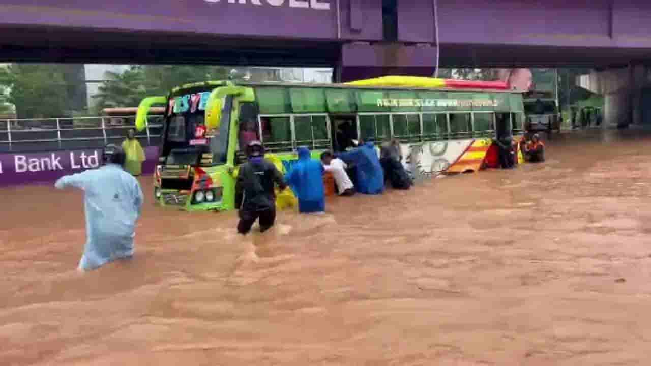 ರಸ್ತೆಯಲ್ಲೇ ಭಾರೀ ಪ್ರಮಾಣದ ಮಳೆ ನೀರು ಹರಿಯುತ್ತಿರುವ ಹಿನ್ನೆಲೆ ಸಂಪೂರ್ಣ ರಸ್ತೆ ಸಂಚಾರ ಬಂದ್ ಆಗಿದೆ. ಇದೀಗ ರಸ್ತೆಯುದ್ದಕ್ಕೂ ವಾಹನಗಳು ಸಾಲುಗಟ್ಟಿ ನಿಂತಿವೆ. ಮಳೆ ನೀರಿನಲ್ಲೇ ಸಂಚರಿಸಲು ಯತ್ನಿಸಿದ ಖಾಸಗಿ ಬಸ್ಸೊಂದು ನಡುರಸ್ತೆಯಲ್ಲೇ ಕೆಟ್ಟು ನಿಂತಿದ್ದು, ನಂತರ ಸ್ಥಳೀಯರು ಬಸ್ನ್ನು ತಳ್ಳಿ ರಸ್ತೆ ಪಕ್ಕಕ್ಕೆ ನಿಲ್ಲಿಸಿದ್ದಾರೆ. ಇನ್ನು ಪಂಪ್ವೆಲ್ ವೃತ್ತದಲ್ಲಿ ಯಾವ ರೀತಿ ನೀರು ತುಂಬಿದೆ ಎನ್ನುವುದನ್ನು ವಿಡಿಯೋನಲ್ಲಿ ನೋಡಿ.