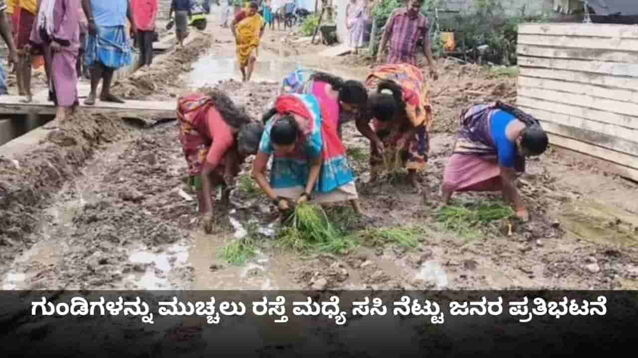 ಗುಂಡಿಗಳನ್ನು ಮುಚ್ಚಲು ರಸ್ತೆ ಮಧ್ಯೆ ಸಸಿ ನೆಟ್ಟು ಜನರ ಪ್ರತಿಭಟನೆ