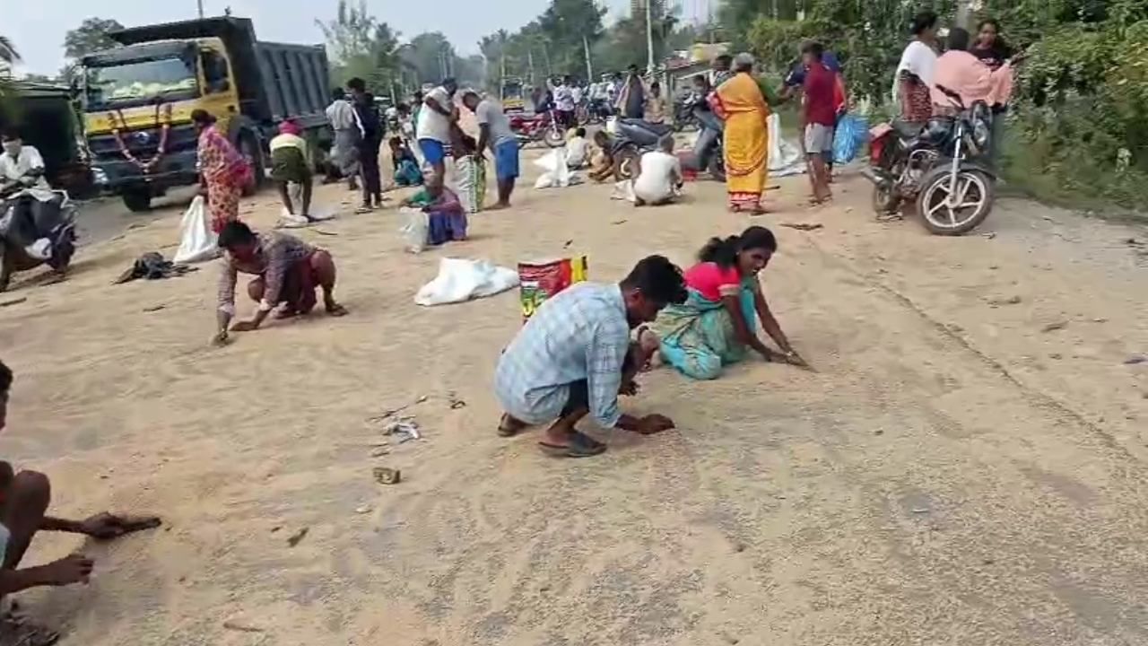 ತುಮಕೂರಿನಲ್ಲಿ ಗೋಧಿ ಲಾರಿ ಪಲ್ಟಿ; ರೋಡಿಗೆ ಬಿದ್ದ ಗೋಧಿ ಬಾಚಲು ಮುಗಿಬಿದ್ದ ಜನ