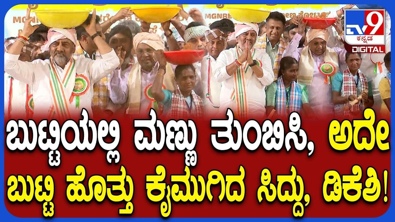 ಚಿಕ್ಕಬಳ್ಳಾಪುರ, (ಫೆಬ್ರವರಿ 23): ಚಿಕ್ಕಬಳ್ಳಾಪುರ (Chikkaballapur) ತಾಲೂಕಿನ ಅಗಲಗುರ್ಕಿ ಬಳಿ ಕಾಂಗ್ರೆಸ್ನ ಮನ್ರೇಗಾ ಬಚಾವ್ ಆಂದೋಲನ ಸಮಾವೇಶ ನಡೆಯುತ್ತಿದ್ದು, ಸಿಎಂ ಸಿದ್ದರಾಮಯ್ಯ, ಡಿಸಿಎಂ ಡಿಕೆ ಶಿವಕುಮಾರ್ ತಮ್ಮ ತಲೆ ಮೇಲೆ ಮಣ್ಣಿನ ಬುಟ್ಟಿ ಹೊತ್ತು ಸಮಾವೇಶಕ್ಕೆ ಚಾಲನೆ ನೀಡಿದ್ದಾರೆ. ಕಾಂಗ್ರೆಸ್ ನಾಯಕರು ವೇದಿಕೆ ಮೇಲೆನೆ ಮಣ್ಣನ್ನು ತೋಡಿ ಪುಟ್ಟಿಗೆ ಹಾಕಿದ್ದು, ಇದನ್ನು ಡಿಕೆ ಶಿವಕುಮಾರ್ ಹಾಗೂ ಸಿದ್ದರಾಮಯ್ಯ ತಲೆಗೆ ಟವೆಲ್ ಸುತ್ತಿಕೊಂಡು ಮಣ್ಣಿನ ಪುಟ್ಟಿ ಹೊತ್ತು ಕೇಂದ್ರ ಸರ್ಕಾರಕ್ಕೆ ಟಾಂಗ್ ಕೊಟ್ಟಿದ್ದಾರೆ.