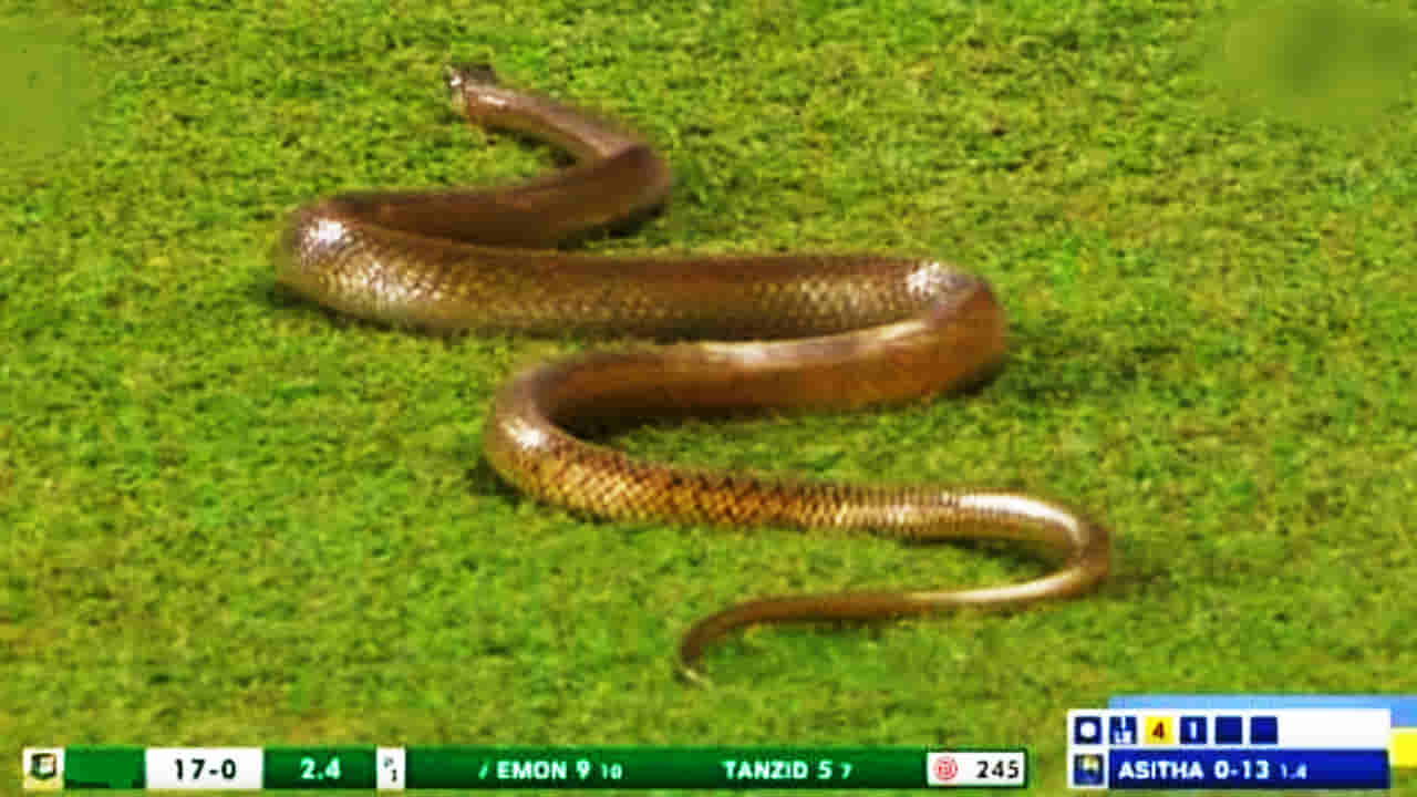 ಶ್ರೀಲಂಕಾದಲ್ಲಿ ಪಂದ್ಯ ನಡೆಯುವಾಗ ಹಾವು ಕಾಣಿಸಿಕೊಳ್ಳುವುದು ಹೊಸ ವಿಷಯವಲ್ಲ. ಅದು ಈಗ ಬಾಂಗ್ಲಾದೇಶ್-ಶ್ರೀಲಂಕಾ ನಡುವಣ ಸರಣಿಯಲ್ಲೂ ಮುಂದುವರೆದಿದೆ. ಕೊಲಂಬೊದ ಆರ್. ಪ್ರೇಮದಾಸ ಮೈದಾನದಲ್ಲಿ ನಡೆಯುತ್ತಿದ್ದ ಮೊದಲ ಏಕದಿನ ಪಂದ್ಯದ ವೇಳೆ ಮೈದಾನಕ್ಕೆ ಹಾವು ನುಗ್ಗಿದೆ. ಅಲ್ಲದೆ ಕೆಲ ಹೊತ್ತು ಮೈದಾನದಲ್ಲೇ ಓಡಾಡಿಕೊಂಡಿದೆ. ಇದರಿಂದ ಕೆಲ ಹೊತ್ತು ಪಂದ್ಯ ಸ್ಥಗಿತಗೊಂಡಿತು.