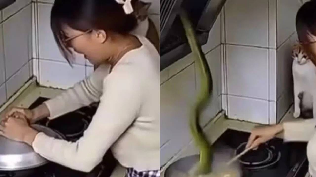 ಅಡುಗೆ ಮನೆಯಲ್ಲಿ ಒಂದು ಜಿರಳೆ ಬಂದರೆ ಹೆಣ್ಣುಮಕ್ಕಳು ಹೌಹಾರುತ್ತಾರೆ. ಅಂಥಹುದರಲ್ಲಿ ಪಾತ್ರೆಯೊಳಗೆ ಹಾವು ಬಿದ್ದರೆ ಹೇಗಾಗಬೇಡ. ಸಾಮಾಜಿಕ ಜಾಲತಾಣಗಳಲ್ಲಿ ವಿಡಿಯೋ ಒಂದು ವೈರಲ್ ಆಗುತ್ತಿದೆ. ಮಹಿಳೆ ಎಂದಿನಂತೆ ಅಡುಗೆ ಮಾಡುತ್ತಿರುತ್ತಾರೆ. ಅವರ ಮನೆಯ ಬೆಕ್ಕು ಅಡುಗೆ ಬೆಡ್ ಮೇಲೆ ಕುಳಿತು ಏನೋ ದಿಟ್ಟಿಸಿ ನೋಡುತ್ತಿರುತ್ತದೆ. ನೋಡ ನೋಡುತ್ತಲೇ ಚಿಮಣಿಯಿಂದ ಏಕಾಏಕಿ ಹಾವು ಅಡುಗೆಯ ಪಾತ್ರೆಯೊಳಗೆ ಬಿದ್ದಿದೆ. ಕೂಡಲೇ ಮಹಿಳೆ ಒಮ್ಮೆ ಗಾಬರಿಗೊಂಡರೂ ಕೂಡಲೇ ಆ ಪಾತ್ರೆಗೆ ಮುಚ್ಚುಳವನ್ನು ಮುಚ್ಚಿದ್ದಾರೆ. ಭಯ ಮತ್ತು ಆತಂಕದ ಹೊರತಾಗಿಯೂ, ಆ ಮಹಿಳೆ ಧೈರ್ಯ ಪ್ರದರ್ಶಿಸಿದ್ದಾರೆ.