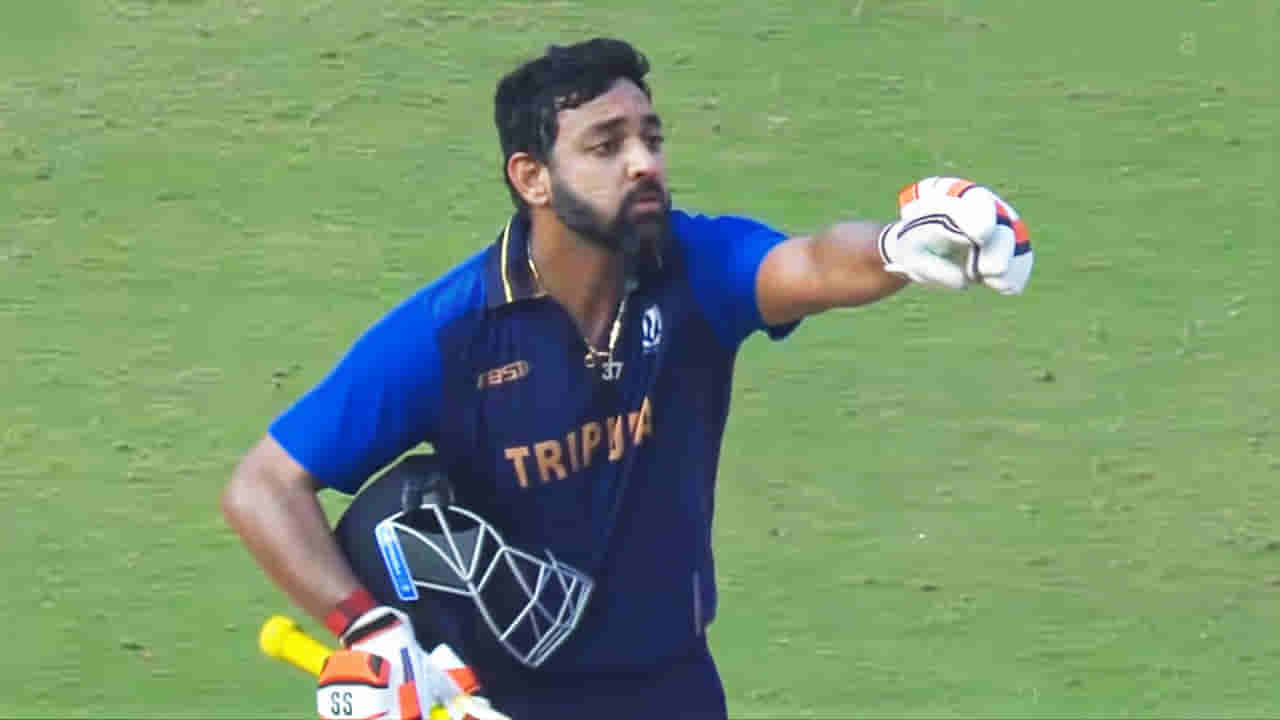 ಈ ಕಠಿಣ ಗುರಿ ಬೆನ್ನತ್ತಿದ ತ್ರಿಪುರ ಪರ 7ನೇ ಕ್ರಮಾಂಕದಲ್ಲಿ ಕಣಕ್ಕಿಳಿದ ಸ್ವಪ್ನಿಲ್ ಸಿಂಗ್ 93 ಎಸೆತಗಳಲ್ಲಿ 2 ಸಿಕ್ಸ್ ಹಾಗೂ 7 ಫೋರ್ಗಳೊಂದಿಗೆ ಶತಕ ಸಿಡಿಸಿದರು. ಈ ಶತಕದ ಬೆನ್ನಲ್ಲೇ ಬ್ಯಾಟ್ ಮೂಲಕ ಅಶ್ಲೀಲ ಸನ್ನೆ ಮಾಡಿ ಸ್ವಪ್ನಿಲ್ ವಿಚಿತ್ರವಾಗಿ ಸಂಭ್ರಮಿಸಿದರು. ಇದೀಗ ಈ ವಿಡಿಯೋ ಸೋಷಿಯಲ್ ಮೀಡಿಯಾದಲ್ಲಿ ವೈರಲ್ ಆಗಿದೆ.