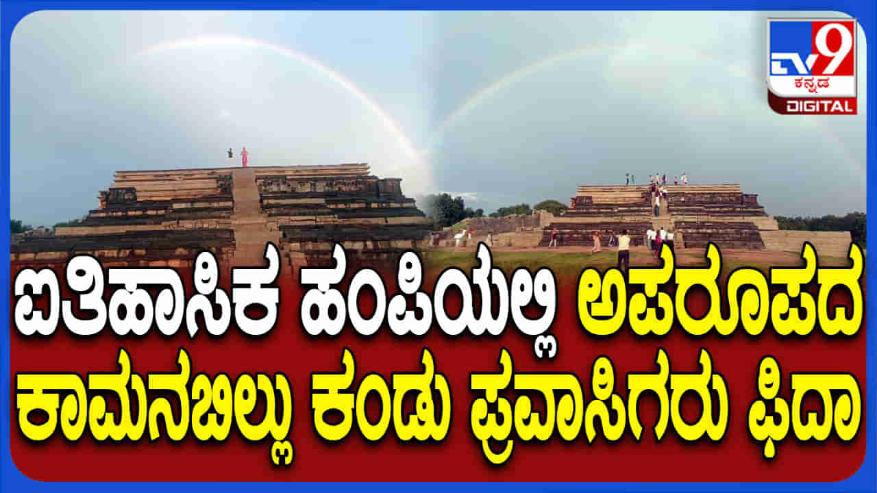 ವಿಜಯನಗರದ ಹೊಸಪೇಟೆ ತಾಲುಕಿನ ಹಂಪಿ ಮಹಾನವಮಿ ದಿಬ್ಬ ತನ್ನದೇ ಆದ ಇತಿಹಾಸವನ್ನು ಹೊಂದಿದ್ದು, ಪ್ರವಾಸಿಗರ ನೆಚ್ಚಿನ ತಾಣವಾಗಿದೆ. ಈ ದಿಬ್ಬದ ಮೇಲೆ ಕಾಮನಬಿಲ್ಲು ಕಾಣಿಸಿಕೊಂಡಿರುವುದು ಪ್ರವಾಸಿಗರಿಗೆ ಇನ್ನಷ್ಟು ಮುದ ನೀಡಿದೆ. ಈ ದೃಶ್ಯವನ್ನು ಕಣ್ಣು ತುಂಬಿಕೊಳ್ಳಲು ಪ್ರವಾಸಿಗರು ಧಾವಿಸುತ್ತಿದ್ದಾರೆ. ವೀಡಿಯೋ ಇಲ್ಲಿದೆ.