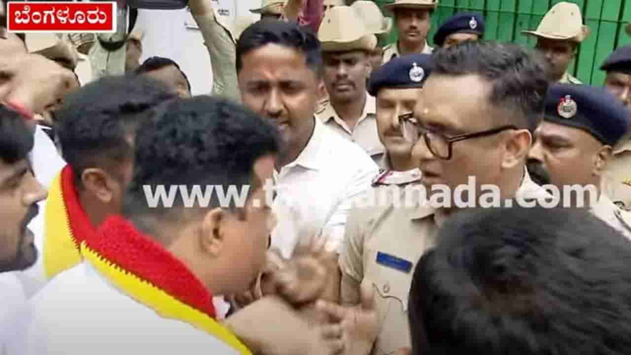 ಬೆಂಗಳೂರು, ಜೂನ್ 24: ಕನ್ನಡ ಪರ ಹೋರಾಟಗಾರ ರೂಪೇಶ್ ರಾಜಣ್ಣ ತಮ್ಮ ಸಂಘಟನೆಯ ಕೆಲ ಸದಸ್ಯರೊಡನೆ ವಸತಿ ಮತ್ತು ಅಲ್ಪಸಂಖ್ಯಾತರ ಕಲ್ಯಾಣ ಖಾತೆ ಸಚಿವ ಬಿಜೆಡ್ ಜಮೀರ್ ಅಹ್ಮದ್ ಖಾನ್ (BZ Zameer Ahmed Khan) ಮನೆ ಮುಂದೆ ಪ್ರತಿಭಟನೆ ನಡೆಸಲು ಬಂದಾಗ ಪೊಲೀಸರು ಅವರನ್ನು ತಡೆದರು. ಅದೇ ಕಾರಣಕ್ಕೆ ಪೊಲೀಸ್ ಮತ್ತು ಕನ್ನಡಪರ ಹೋರಾಟಗಾರರ ನಡುವೆ ಮಾತಿನ ಚಕಮಕಿ ನಡೆಯುತ್ತದೆ. ಒಬ್ಬ ಪೊಲೀಸ್ ಅಧಿಕಾರಿ ಮತ್ತು ರೂಪೇಶ್ ರಾಜಣ್ಣ ನಡುವೆ ಜೋರು ಮಾತಿನ ಕಾಳಗ, ತಳ್ಳಾಟ ನಡೆಯುವುದನ್ನು ದೃಶ್ಯಗಳಲ್ಲ್ಲಿ ನೋಡಬಹುದು. ತಮಗೆ ಮಾತಾಡಲು ಅವಕಾಶ ಕೊಡಿ ಅಂತ ಹೋರಾಟಗಾರು ಹೇಳಿದರೂ ಪೊಲೀಸರು ಅವರನ್ನು ದೂರ ತಳ್ಳುವ ಪ್ರಯತ್ನ ಮಾಡುತ್ತಾರೆ.