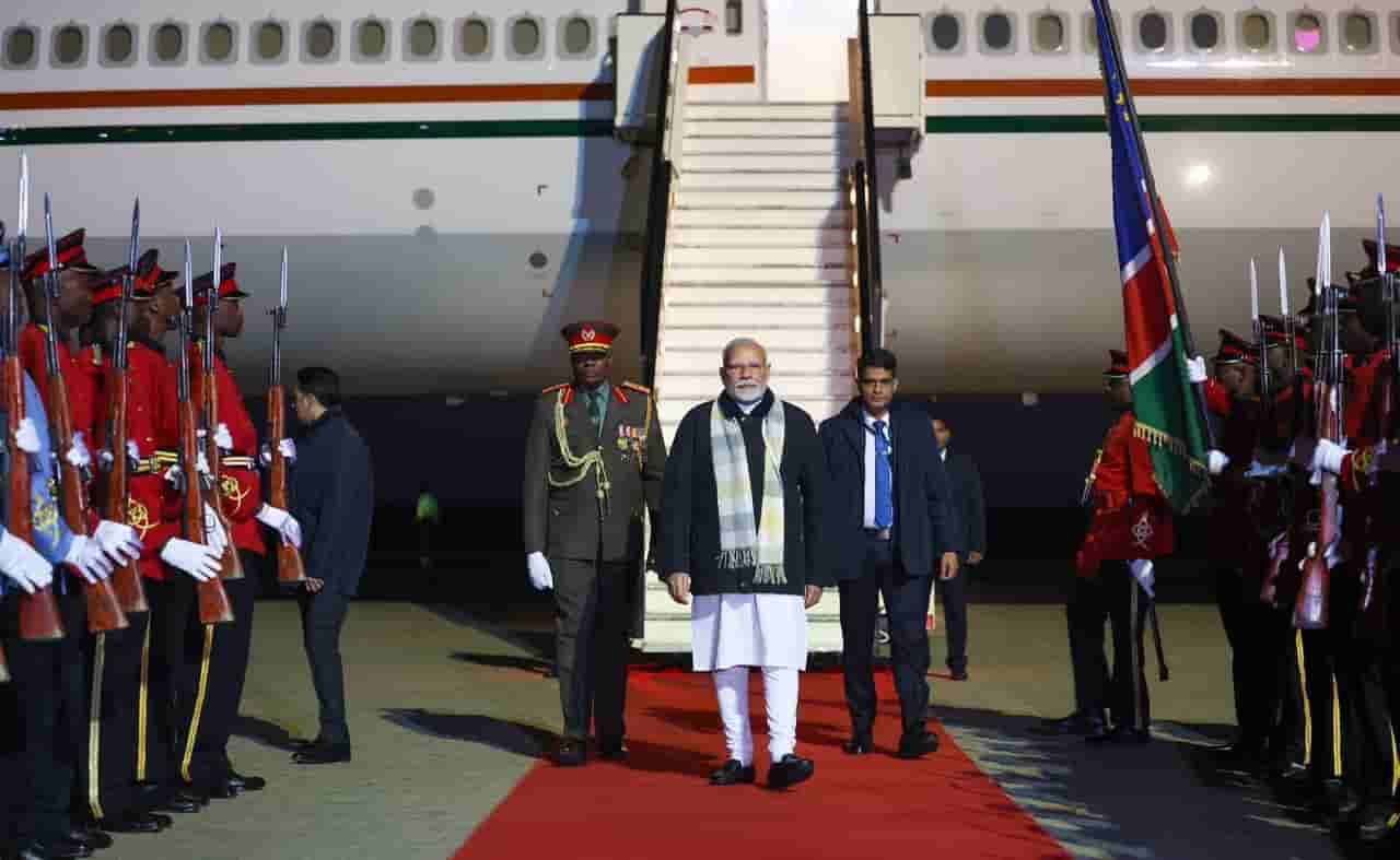 ಪ್ರಧಾನಿ ನರೇಂದ್ರ ಮೋದಿ ನಮೀಬಿಯಾದ ಅಧ್ಯಕ್ಷ ನೆಟುಂಬೊ ನಂದಿ-ದೈತ್ವಾ ಅವರ ಆಹ್ವಾನದ ಮೇರೆಗೆ ನಮೀಬಿಯಾದ ವಿಂಡ್ಹೋಕ್ಗೆ ಬಂದಿಳಿದರು. ಪ್ರಧಾನಿ ಮೋದಿ ಅವರು ತಮ್ಮ ನಾಲ್ಕು ದಿನಗಳ ಬ್ರೆಜಿಲ್ ಪ್ರವಾಸವನ್ನು ಮುಗಿಸಿ, ನೈಋತ್ಯ ಆಫ್ರಿಕಾದ ರಾಷ್ಟ್ರವಾದ ನಮೀಬಿಯಾಕ್ಕೆ ತೆರಳಿದರು, ಅಲ್ಲಿ ಅವರಿಗೆ ಸಾಂಪ್ರದಾಯಿಕ ಸ್ವಾಗತ ದೊರೆಯಿತು. ವಿಮಾನ ನಿಲ್ದಾಣದಲ್ಲಿ ನಮೀಬಿಯಾದ ಸಾಂಪ್ರದಾಯಿಕ ಡ್ರಮ್ ನುಡಿಸಲು ಪ್ರಯತ್ನಿಸಿದರು. ಭಾರತ ಮತ್ತು ನಮೀಬಿಯಾ ನಡುವಿನ ಸಂಬಂಧಗಳು ತುಂಬಾ ಉತ್ತಮವಾಗಿವೆ.