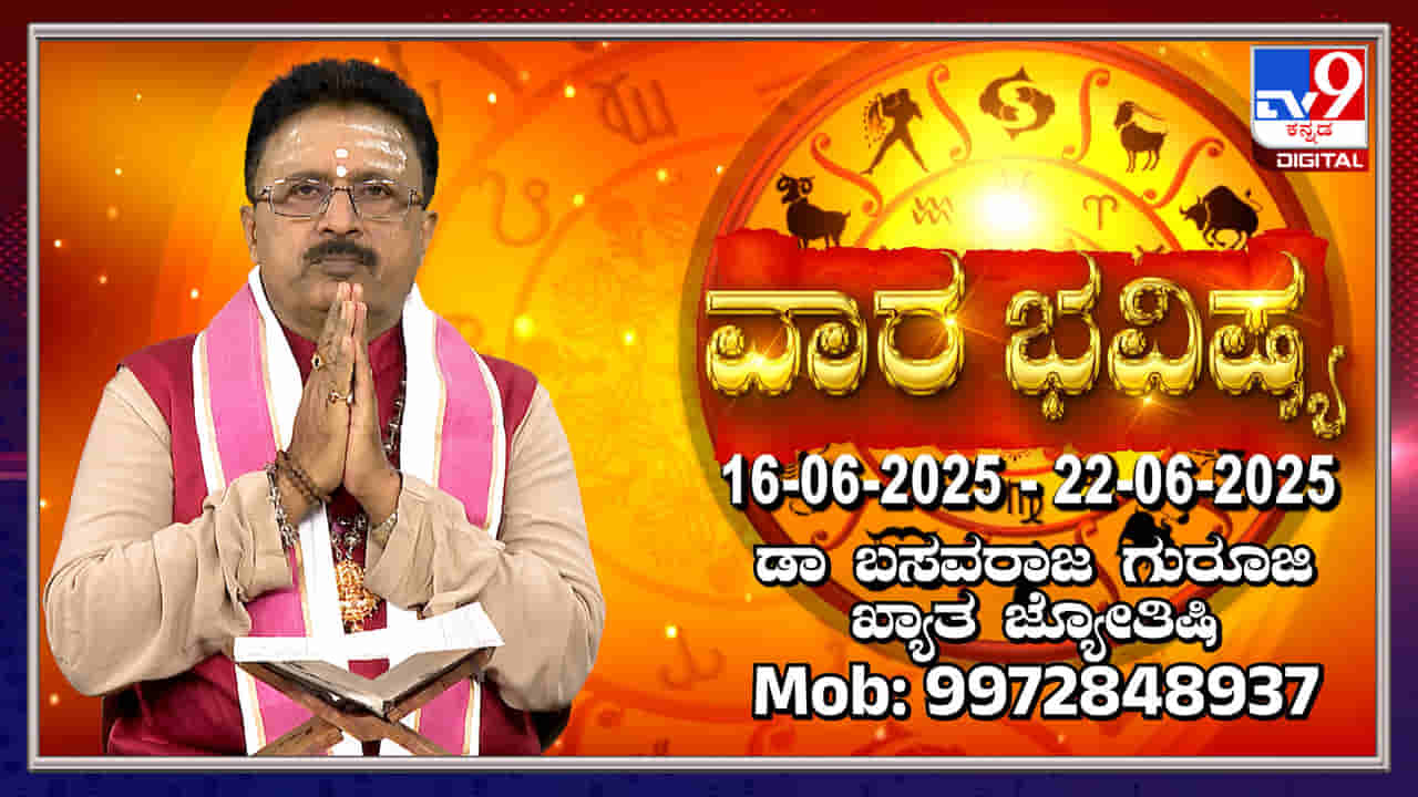 ಬೆಂಗಳೂರು, ಜೂನ್ 15: ವಾರ ಭವಿಷ್ಯ ಕಾರ್ಯಕ್ರಮದಲ್ಲಿ ಖ್ಯಾತ ಜ್ಯೋತಿಷಿ ಡಾ. ಬಸವರಾಜ ಗುರೂಜಿ ಜೂನ್ 16 ರಿಂದ 22ರ ವಾರದ ರಾಶಿಫಲಗಳನ್ನು ವಿವರಿಸಿದ್ದಾರೆ. ಈ ವಾರದ ಗ್ರಹಗತಿಗಳನ್ನು ಪರಿಗಣಿಸಿ ಪ್ರತಿಯೊಂದು ರಾಶಿಗಳ ಫಲಾಫಲಗಳ ಬಗ್ಗೆ ವಿಡಿಯೋದಲ್ಲಿ ಮಾಹಿತಿ ನೀಡಿದ್ದಾರೆ. ಜೊತೆಗೆ ಪ್ರತಿ ರಾಶಿಗೂ ಅದೃಷ್ಟ ಸಂಖ್ಯೆಗಳು ಮತ್ತು ಬಣ್ಣಗಳನ್ನು ಸೂಚಿಸಲಾಗಿದೆ. ವಿಡಿಯೋ ನೋಡಿ.