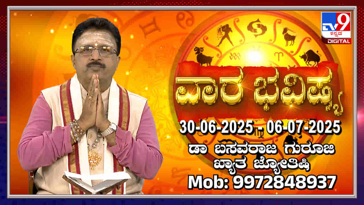ವಾರ ಭವಿಷ್ಯ ಕಾರ್ಯಕ್ರಮದಲ್ಲಿ, ಖ್ಯಾತ ಜ್ಯೋತಿಷಿ ಡಾ. ಬಸವರಾಜ ಗುರೂಜಿಯವರು ಜೂನ್ 30ರಿಂದ ಜುಲೈ 6ರ ವರೆಗಿನ ದ್ವಾದಶ ರಾಶಿಗಳ ಫಲಾಪಲಗಳನ್ನು ವಿವರಿಸಿದ್ದಾರೆ. ಈ ವಾರದ ವಿಶೇಷ ದಿನಾಚರಣೆಗಳು ಮತ್ತು ಗ್ರಹಗಳ ಸ್ಥಿತಿಯ ಬಗ್ಗೆಯೂ ಮಾಹಿತಿ ನೀಡಲಾಗಿದೆ. ಪ್ರತಿ ರಾಶಿಯವರಿಗೆ ಅನುಕೂಲಕರ ದಿನಗಳು, ಸಂಖ್ಯೆಗಳು ಮತ್ತು ಪರಿಹಾರಕ್ರಮಗಳನ್ನು ಸೂಚಿಸಲಾಗಿದೆ.