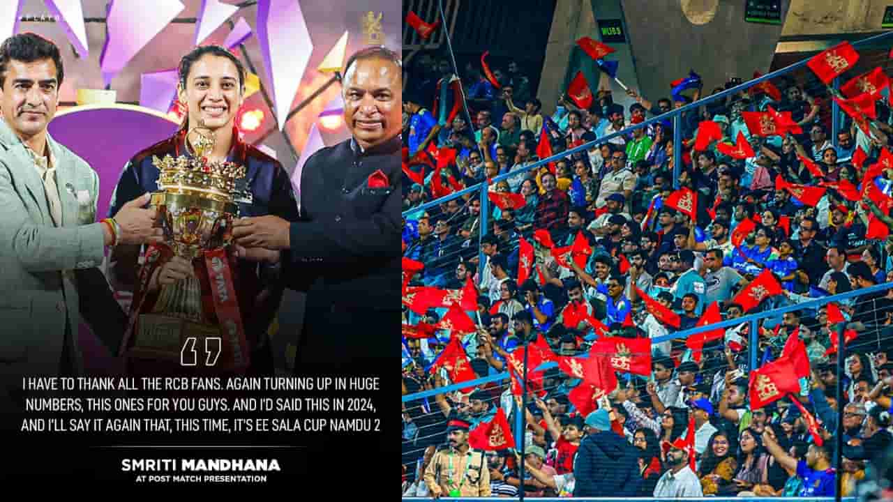ರಾಯಲ್ ಚಾಲೆಂಜರ್ಸ್ ಬೆಂಗಳೂರು ತಂಡ ನಮ್ಮ ಅಭಿಮಾನಿಗಳ ಬಗ್ಗೆ ತುಂಬಾ ಹೆಮ್ಮೆಪಡುತ್ತದೆ. ಆರ್ಸಿಬಿ ಅಭಿಮಾನಿಗಳು ವಿಶ್ವದಲ್ಲೇ ಅತ್ಯುತ್ತಮ ಅಭಿಮಾನಿಗಳು, ಅವರು ತಂಡವನ್ನು ಎಲ್ಲೆಡೆ ಬೆಂಬಲಿಸುತ್ತಾರೆ. ಫೈನಲ್ ಪಂದ್ಯಕ್ಕೆ ಭಾರಿ ಸಂಖ್ಯೆಯಲ್ಲಿ ಬಂದು ತಂಡವನ್ನು ಹುರಿದುಂಬಿಸಿದ ಆರ್ಸಿಬಿ ಅಭಿಮಾನಿಗಳಿಗೆ ಧನ್ಯವಾದ ತಿಳಿಸುತ್ತೇನೆ. ಈ ಟ್ರೋಫಿ ನಿಮ್ಮದು. ನಾನು 2024 ರಲ್ಲಿ ‘ಈ ಸಲ ಕಪ್ ನಮ್ದು’ ಎಂದು ಹೇಳಿದ್ದೆ. ಈ ಬಾರಿ ಮತ್ತೊಮ್ಮೆ ಹೇಳಲು ಬಯಸುತ್ತೇನೆ ‘ಈ ಸಲ ಕಪ್ ನಮ್ದು 2’ ಎಂದಿದ್ದಾರೆ. ಸ್ಮೃತಿ ಅವರ ಈ ಮಾತಿಗೆ ಅಭಿಮಾನಿಗಳು ಕೂಡ ಹುಚ್ಚೆದ್ದು ಸಂಭ್ರಮಿಸಿದರು.