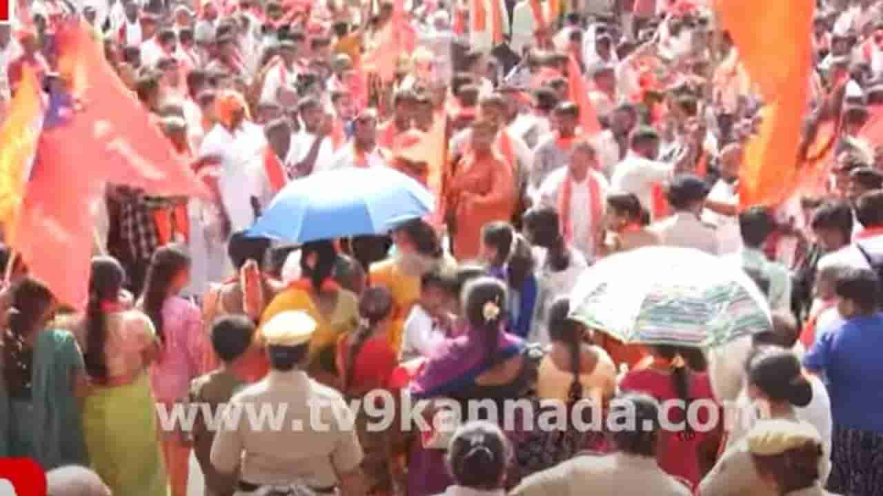 ಮಂಡ್ಯ, ಏಪ್ರಿಲ್ 12: ನಗರದಲ್ಲಿ ಹಿಂದೂ ಸಂಘಟನೆಗಳು ಹನುಮ ಜಯಂತಿ (Hanuma Jayanti) ನಿಮಿತ್ತ ಆಯೋಜಿಸಿರುವ ಶೋಭಾಯಾತ್ರೆ ಅದ್ದೂರಿಯಾಗಿ ನಡೆಯುತ್ತಿದೆ. ಡಿಜೆ ಸೌಂಡ್ನ ಅಬ್ಬರ ದೂದೂರದವರೆಗೆ ಕೇಳಿಸುತ್ತಿದೆ. ಉರಿಬಿಸಿಲಲ್ಲೂ ಡಿಜೆ ಮ್ಯೂಸಿಕ್ಗೆ ಯುವಕರು ಮೈ ಮರೆತು ಕುಣಿಯುತ್ತಿದ್ದಾರೆ, ಅನೇಕರ ಕೈಗಳಲ್ಲಿ ಭಗ್ವಾಗಳಿವೆ. ಯುವಕರ ಕುಣಿತ ಮತ್ತು ಡಿಜೆ ಮ್ಯೂಸಿಕ್ ನಿಂದ ಪ್ರೇರಿತರಾಗಿರುವ ಮಹಿಳೆಯರು ಸಹ ಕುಣಿಯುತ್ತಿದ್ದಾರೆ. ಪ್ರತ್ಯೇಕವಾಗಿ ಕುಣಿಯುತ್ತಿದ ಮಹಿಳೆಯರಿಗೆ ಮುಂದೆ ಕರೆದು ಡ್ಯಾನ್ಸ್ ಮಾಡುವ ಅವಕಾಶ ಕಲ್ಪಿಸಲಾಗುತ್ತದೆ. ಯುವತಿಯರು ಯುವಕರಿಗೆ ಕಮ್ಮಿಯಿಲ್ಲದಂತೆ ಕುಣಿದರು.
