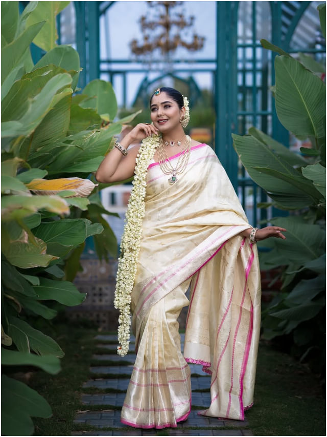 ತಮ್ಮಷ್ಟೇ ಉದ್ದ ಇರುವ ಮಲ್ಲಿಗೆ ಹಾರ ಮುಡಿದು ಪೋಸ್ ನೀಡಿದ ಸುಂದರಿ.